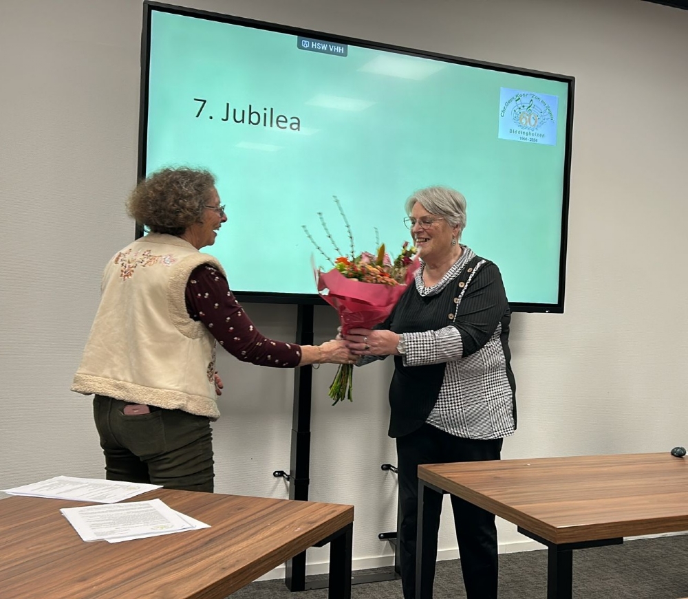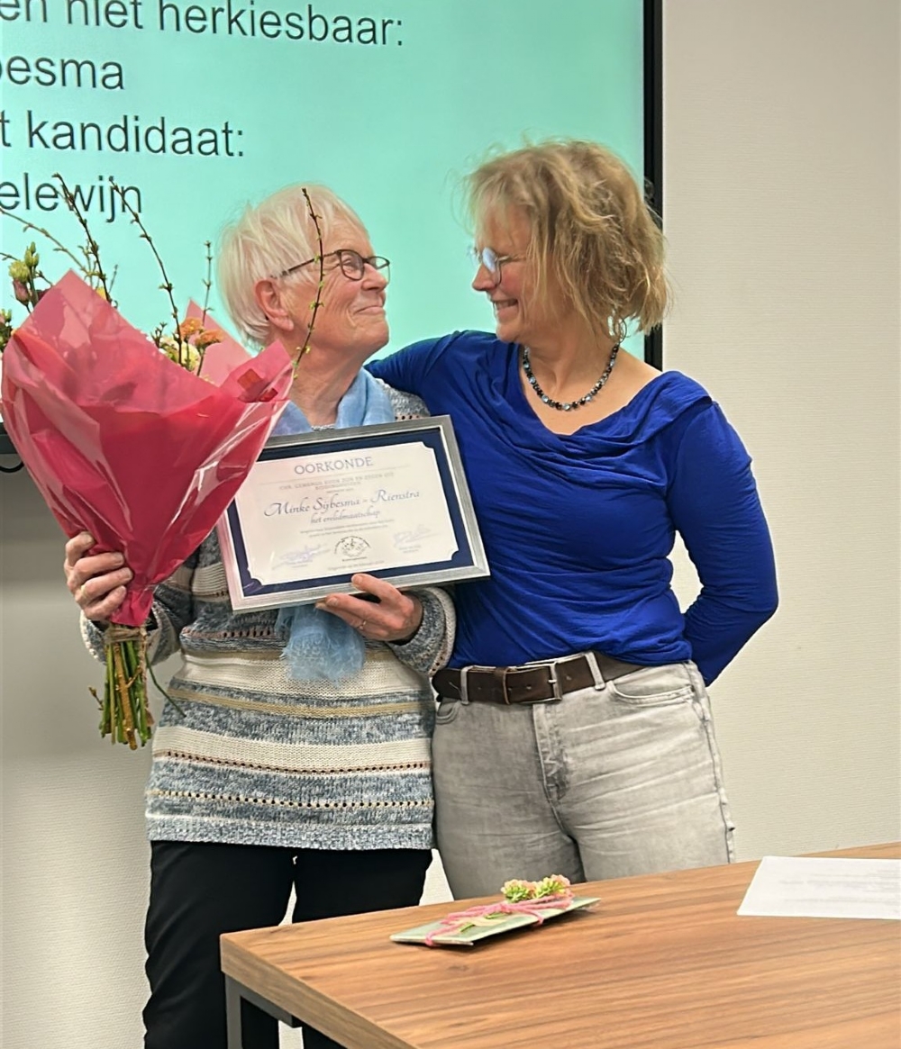 Tijdens de algemene ledenvergadering van het koor Zon en Zegen uit Biddinghuizen is Minke Sybesma benoemd tot erelid van het koor. Minke is inmiddels 50 jaar lid van het koor - waarvoor ze ook een onderscheiding kreeg diezelfde avond. En naast haar werd Lenie Christiaanse in het zonnetje gezet voor 55 jaar lidmaatschap.