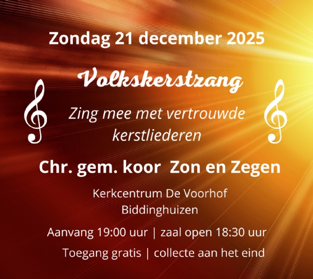 Zondag 21 december 2025: Jaarlijkse Volkskerstzang Biddinghuizen georganiseerd door Zon en Zegen